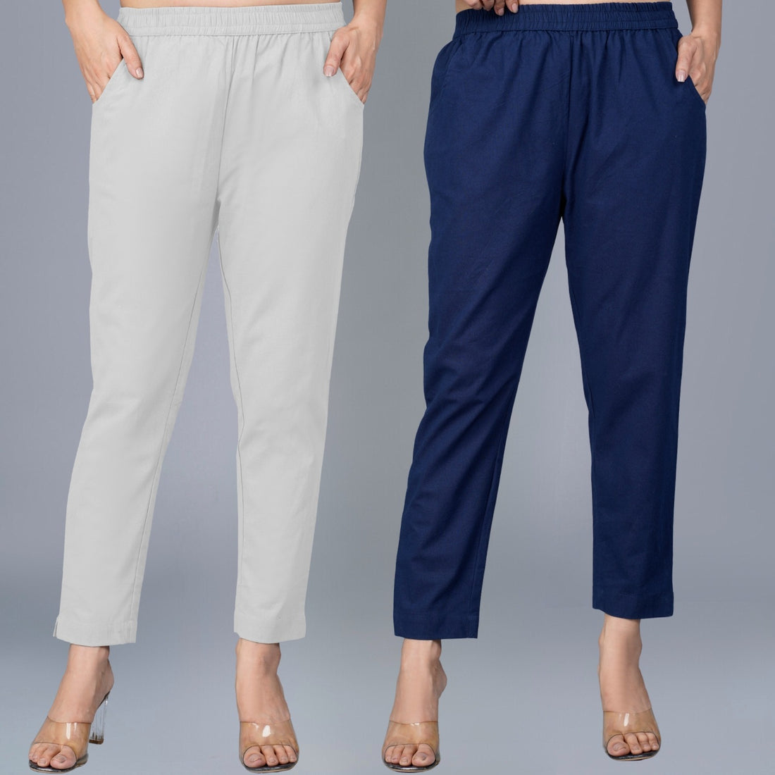 Pack Of 2 Womens Regular Fit Melange Grey And Navy Blue Fully Elastic Waistband Cotton Trouser