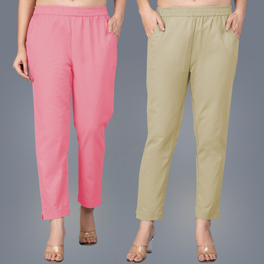 Pack Of 2 Womens Regular Fit Mauve Pink And Beige Fully Elastic Waistband Cotton Trouser