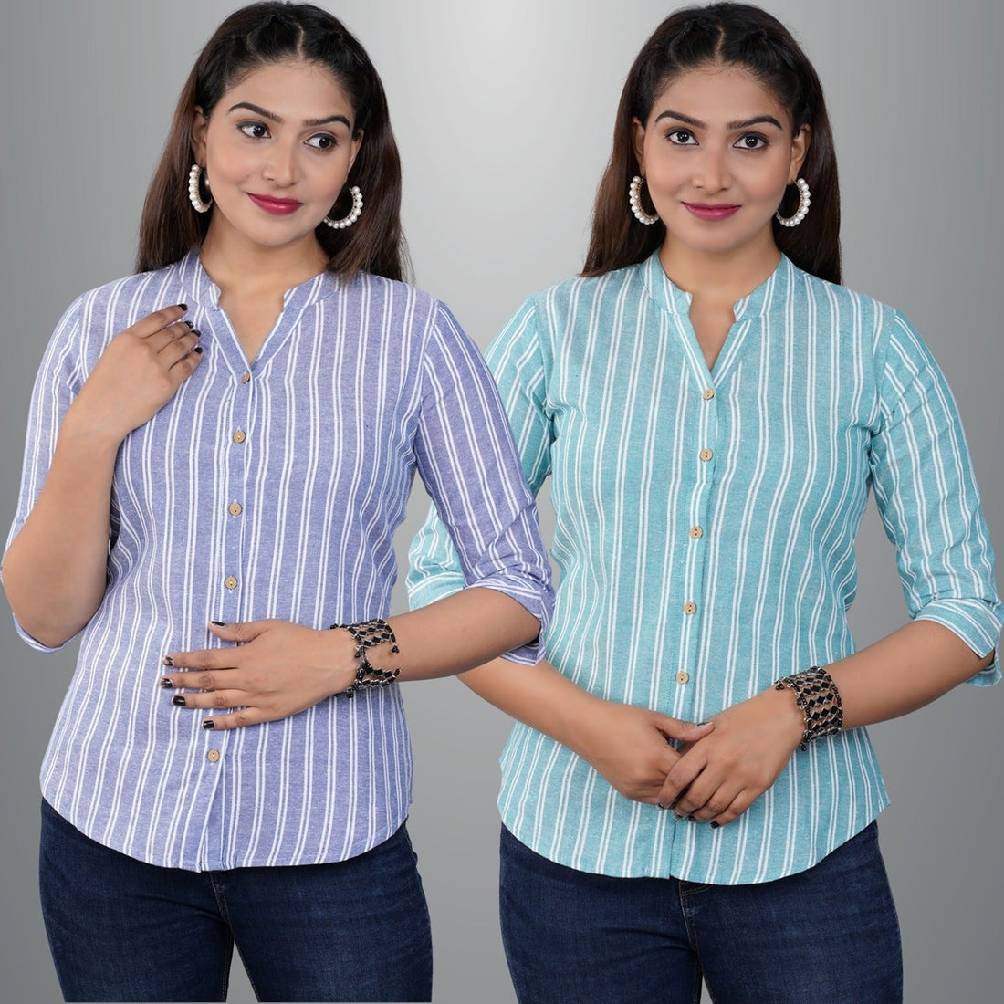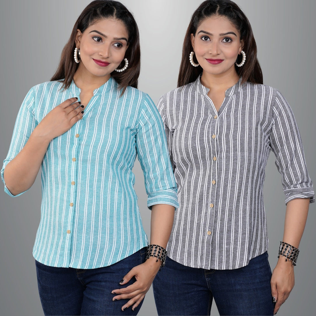Pack Of 2 Womens Grey And Turquoise Mangoline Striped Casual Shirt