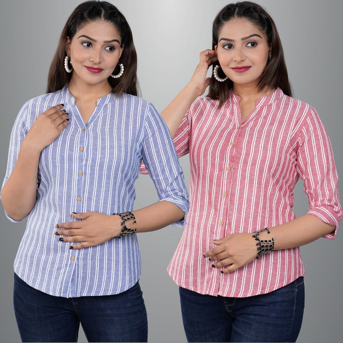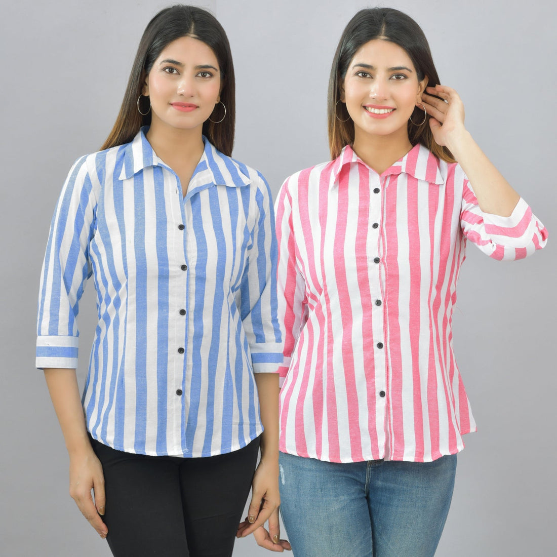 Pack Of 2 Womens Blue And Pink Spread Collar Striped Shirt Combo