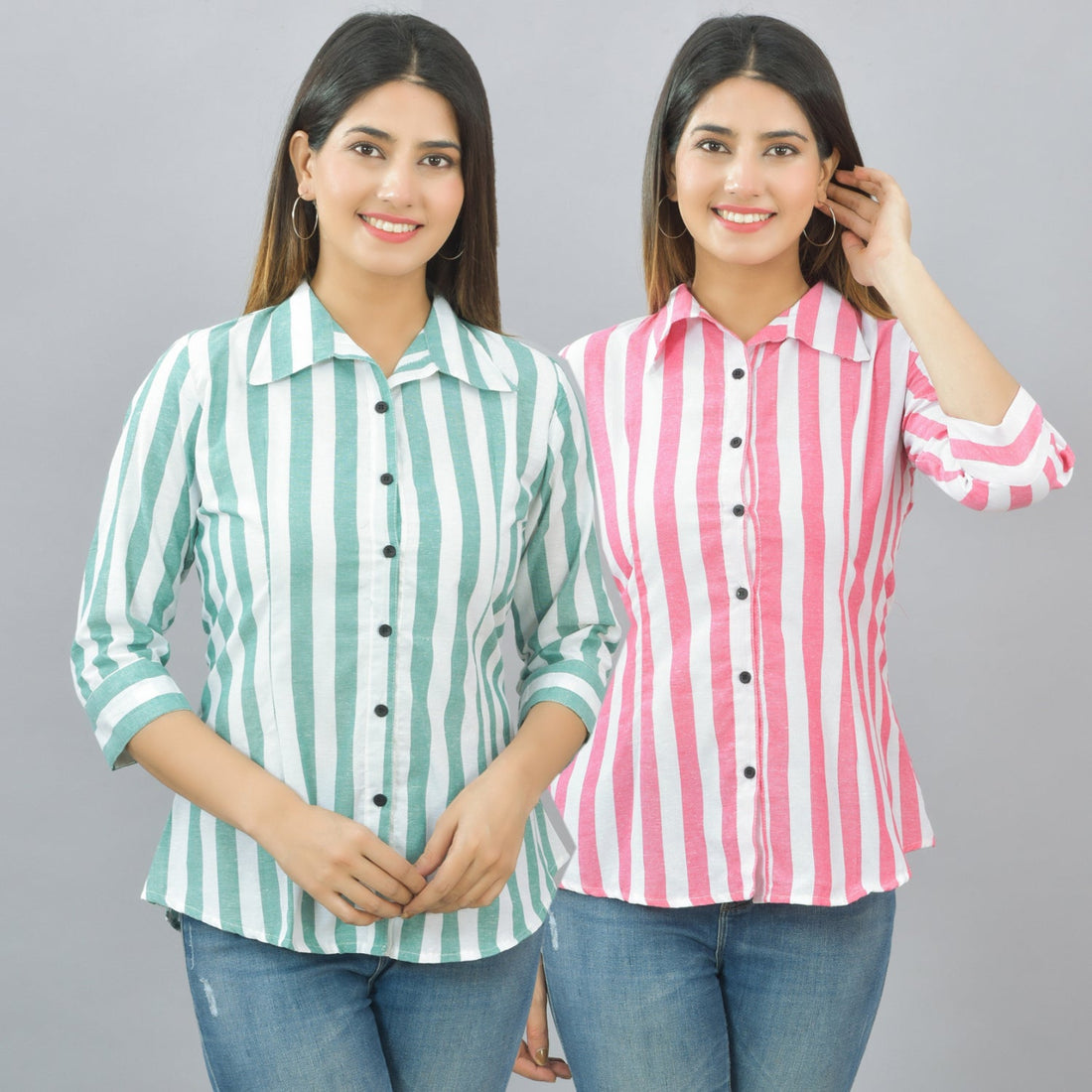 Pack Of 2 Womens Green And Pink Spread Collar Striped Shirt Combo