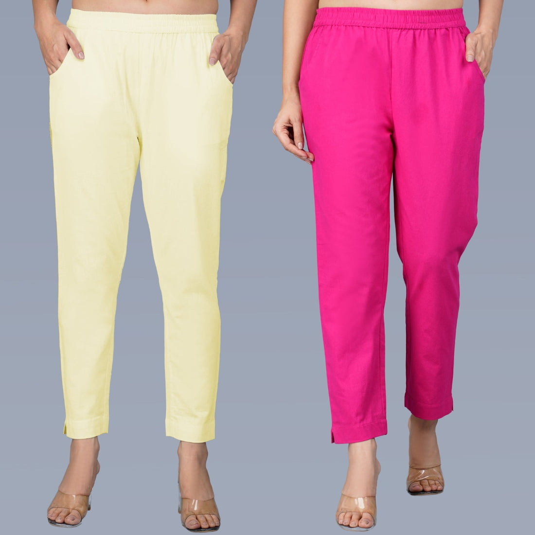 Pack Of 2 Womens Regular Fit Cream And Rani Fully Elastic Waistband Cotton Trouser