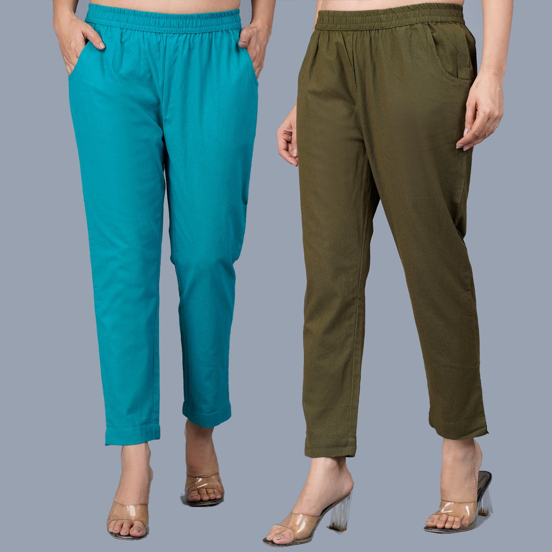 Pack Of 2 Womens Regular Fit Cyan And Dark Green Fully Elastic Waistband Cotton Trouser