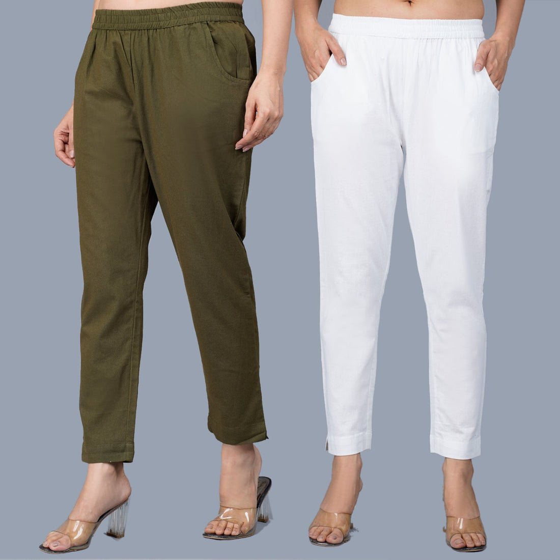 Pack Of 2 Womens Regular Fit Dark Green And White Fully Elastic Waistband Cotton Trouser