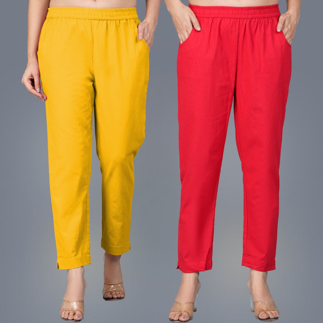 Pack Of 2 Womens Regular Fit Mustard And Red Fully Elastic Waistband Cotton Trouser