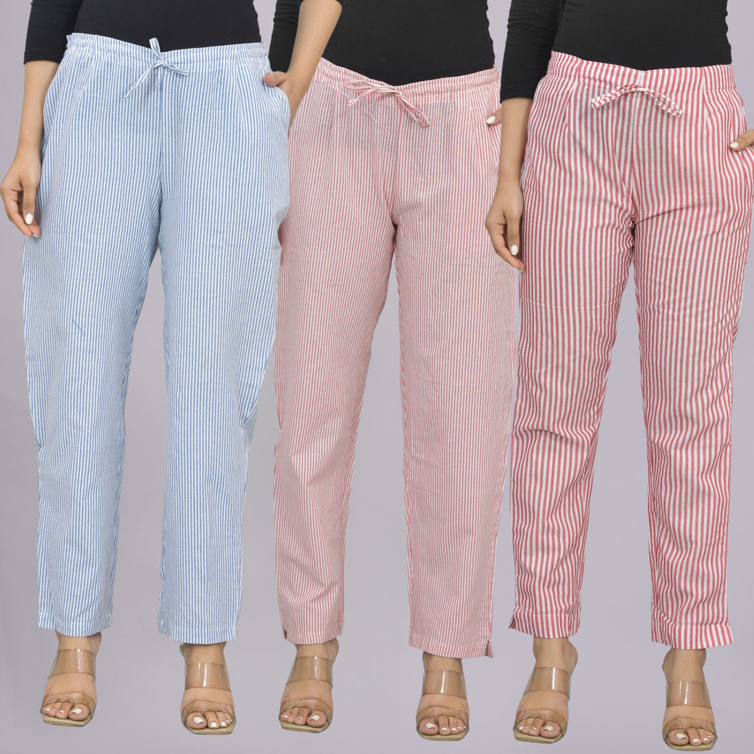 Pack Of 3 Womens Blue, Pink, Red Cotton Stripe Trousers Combo