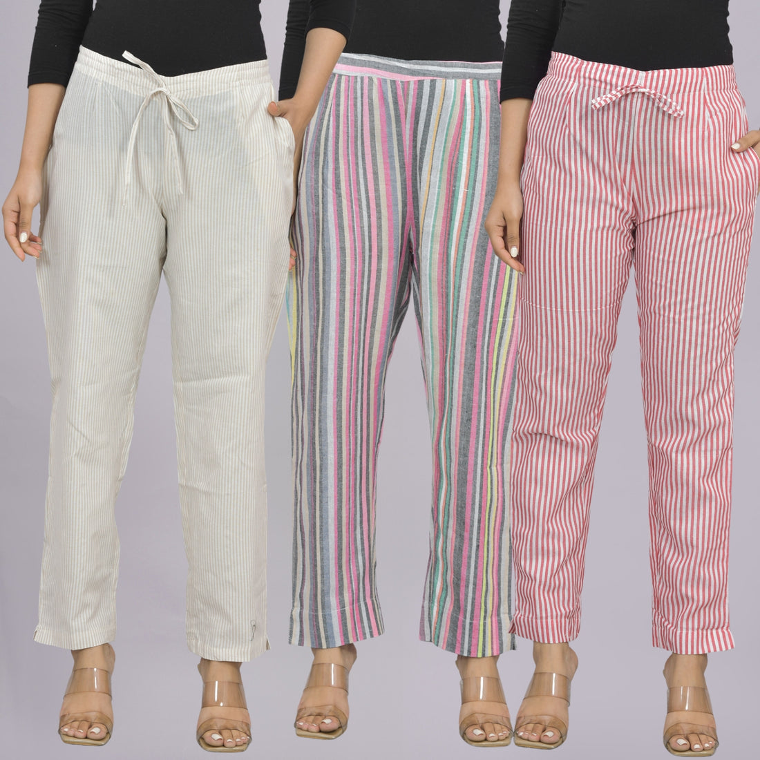 Pack Of 3 Womens Cream, Multicolor, Red Cotton Stripe Trousers Combo