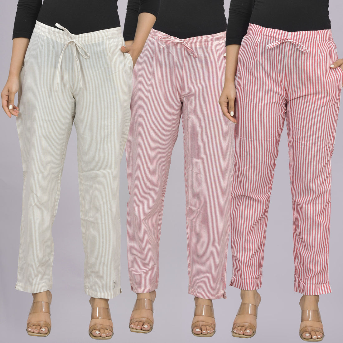Pack Of 3 Womens Cream, Pink, Red Cotton Stripe Trousers Combo