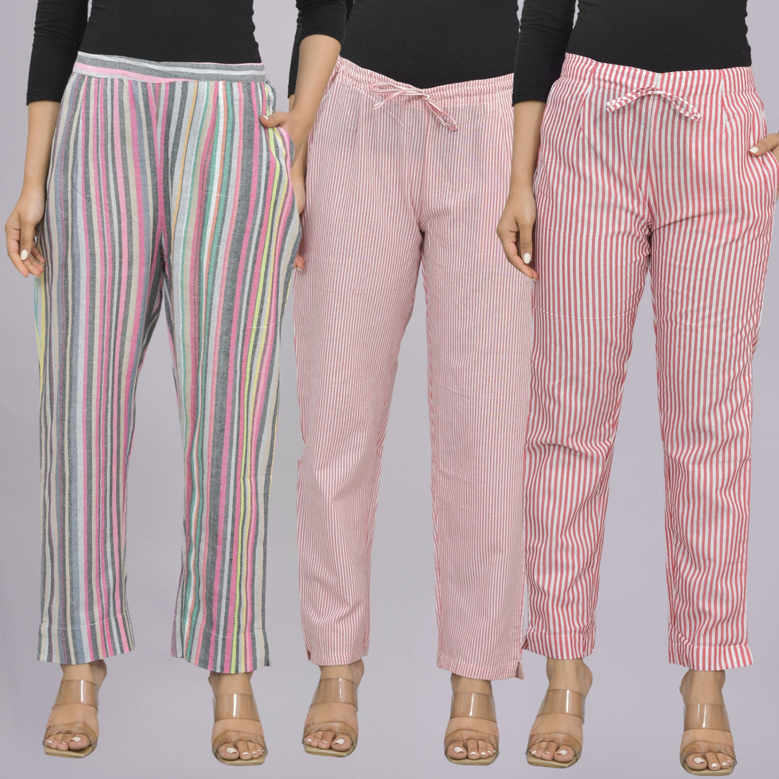 Pack Of 3 Womens Multicolor, Pink, Red Cotton Stripe Trousers Combo