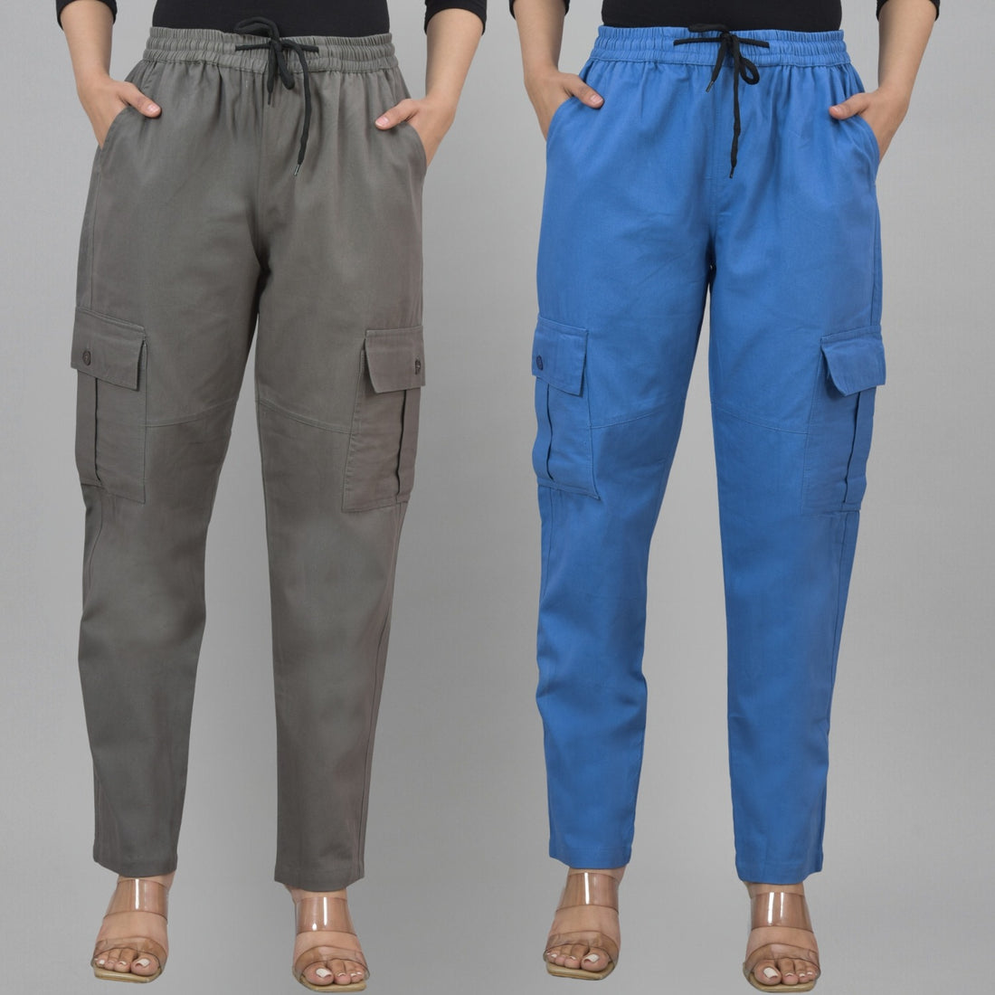 Pack Of 2 Womens Melange Grey And Navy Blue 5 Pocket Twill Straight Cargo Pants
