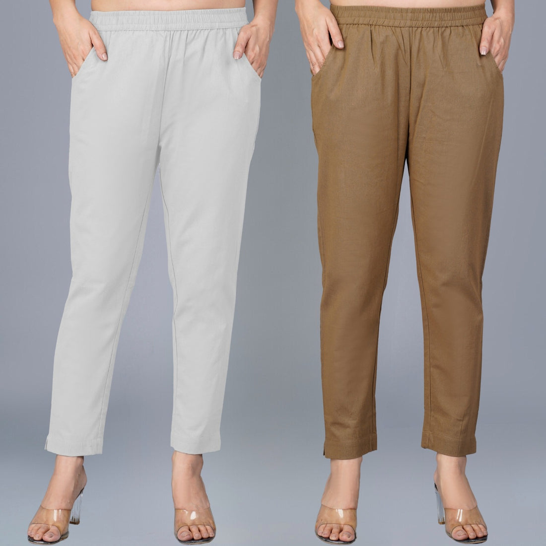 Pack Of 2 Womens Regular Fit Melange Grey And Brown Fully Elastic Waistband Cotton Trouser