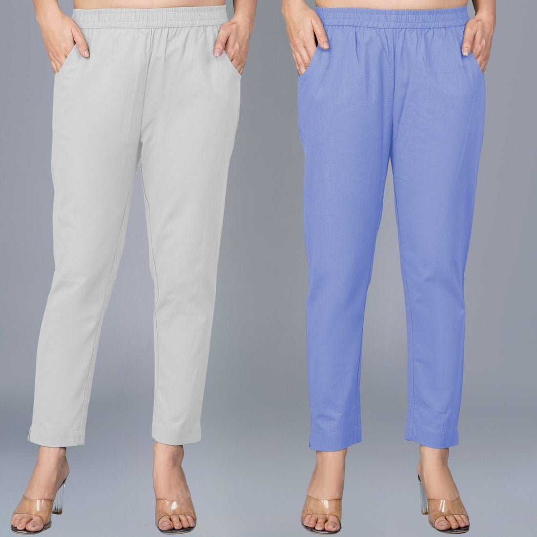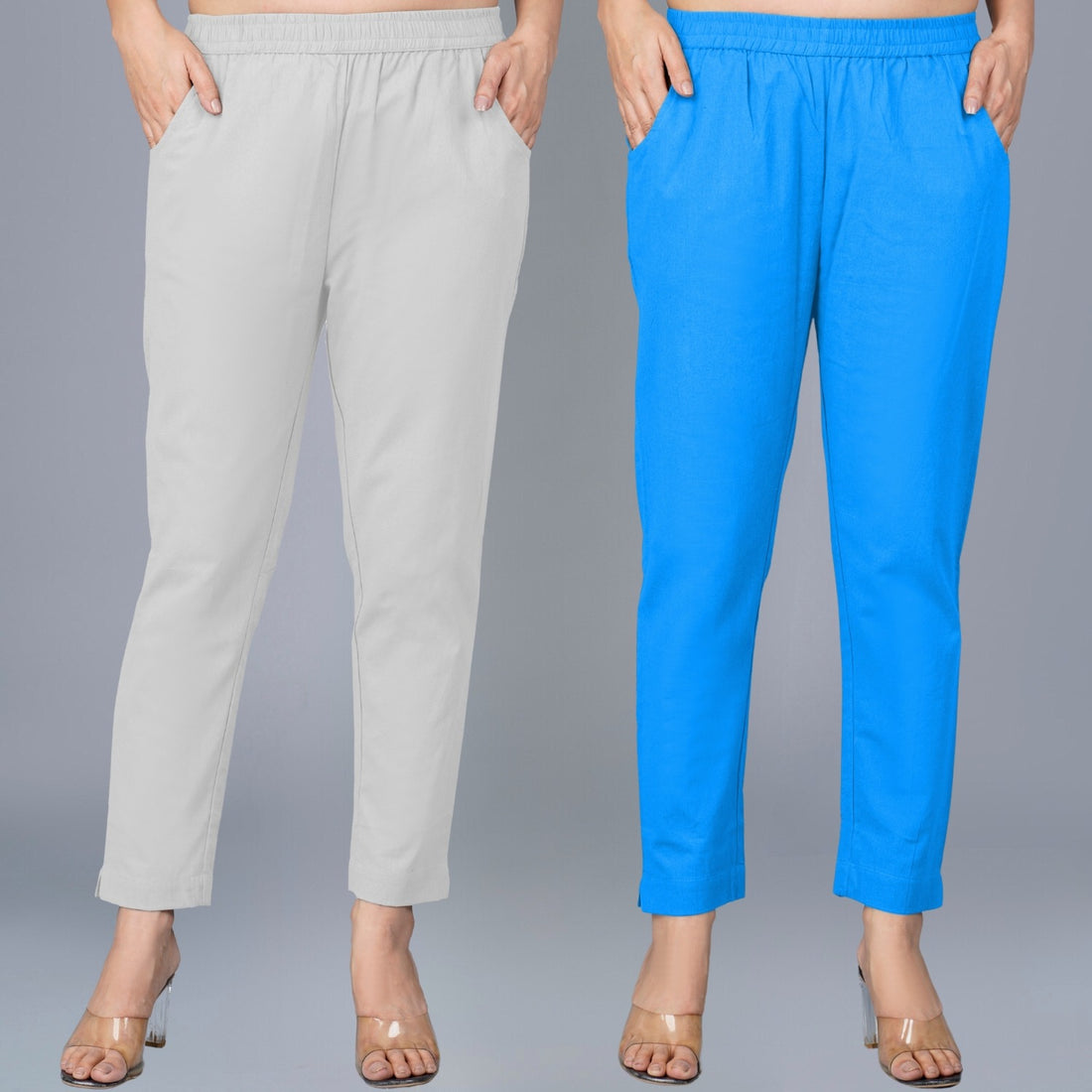 Pack Of 2 Womens Regular Fit Melange Grey And Sky Blue Fully Elastic Waistband Cotton Trouser