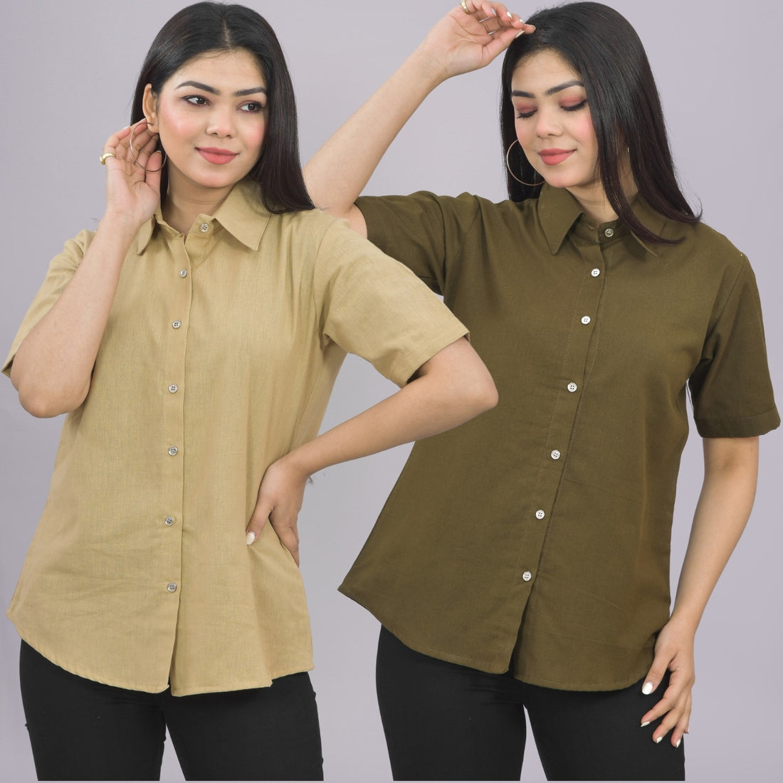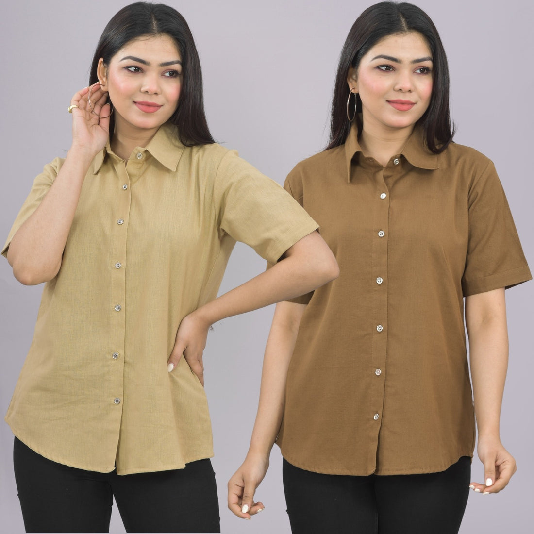 Pack Of 2 Womens Solid Beige And Brown Half Sleeve Cotton Shirts Combo