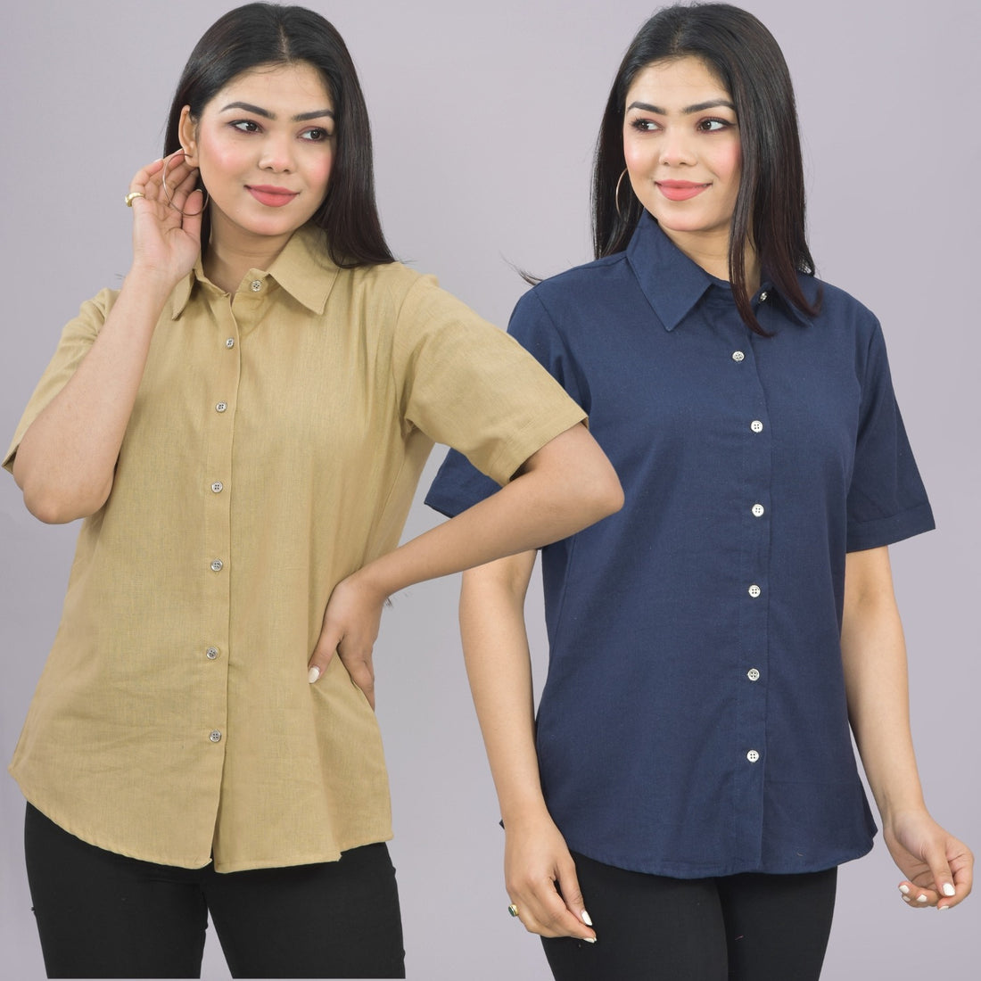 Pack Of 2 Womens Solid Beige And Navy Blue Half Sleeve Cotton Shirts Combo