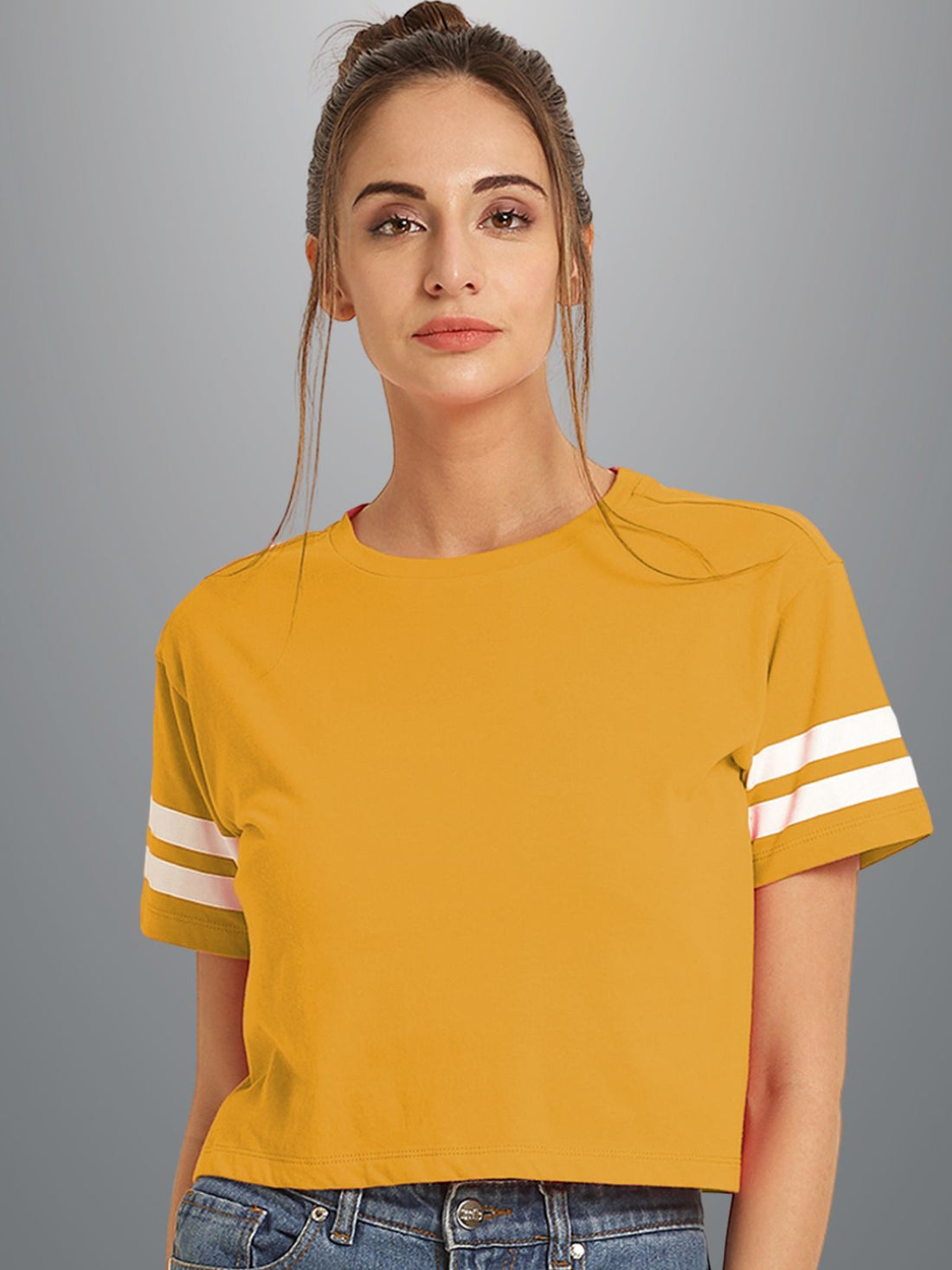 Womens Solid Mustard Cotton Crop Top With Designer White Stripe