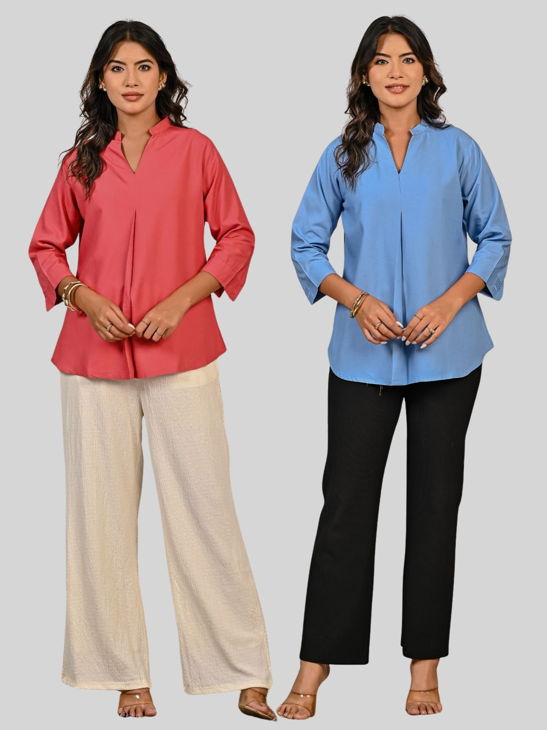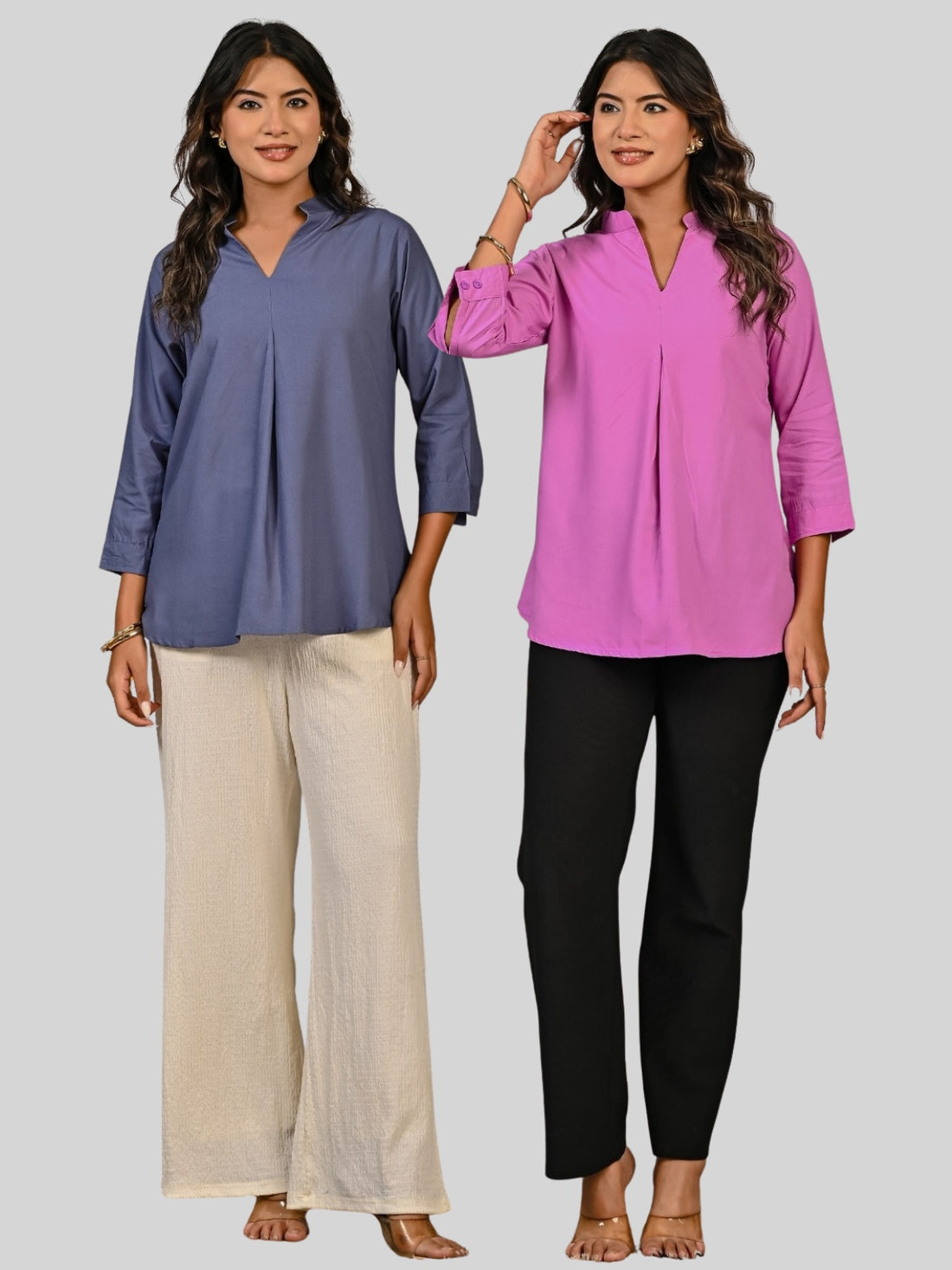 Solid Mauve Pink And Sky Blue V Neck Viscose Pleated Tops Combo