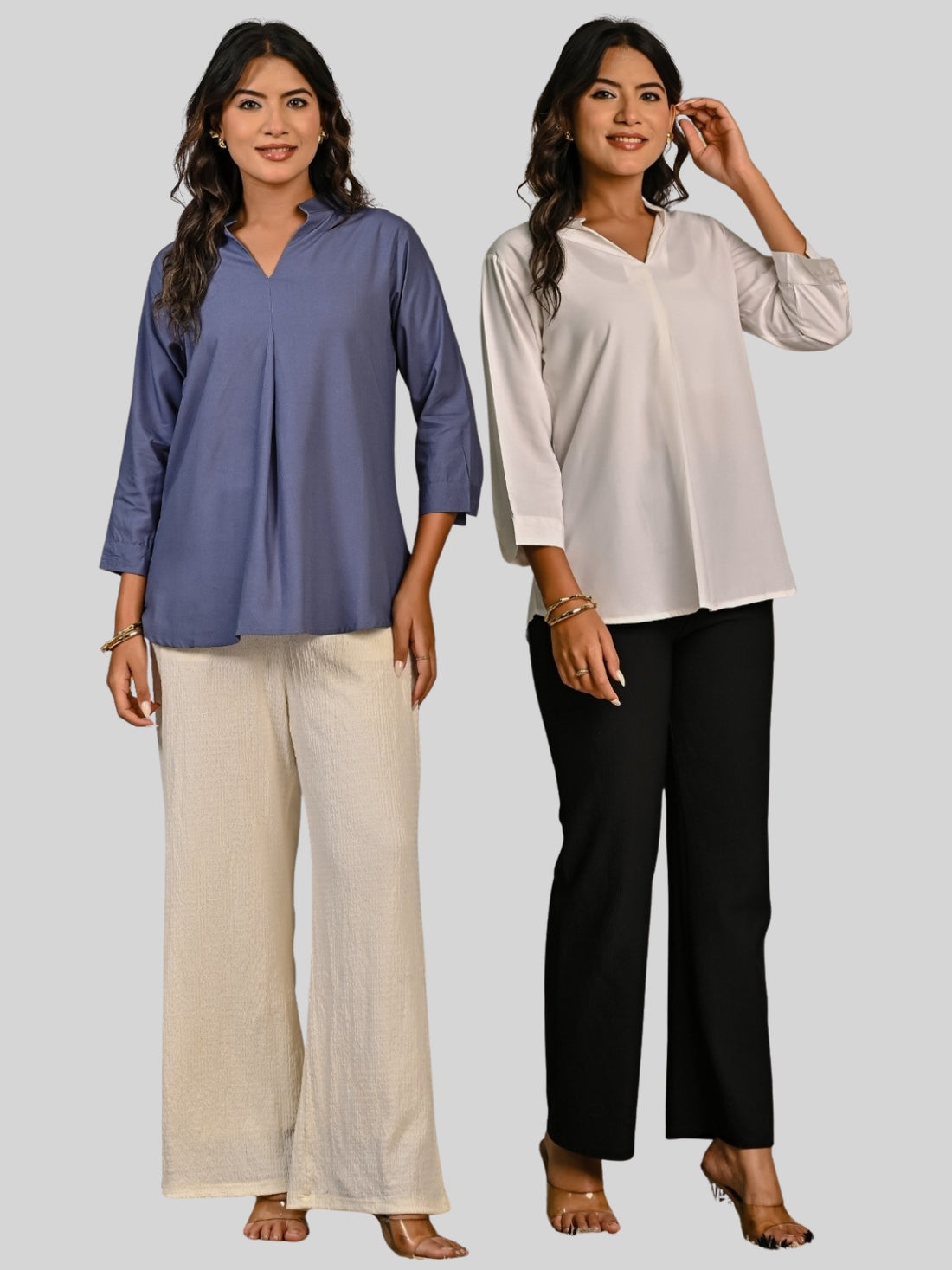 Solid Grey And Sky Blue V Neck Viscose Pleated Tops Combo