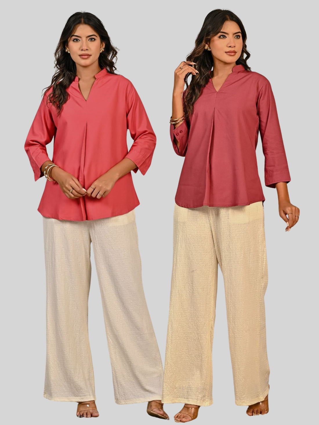 Solid Mauve Pink And Pink V Neck Viscose Pleated Tops Combo