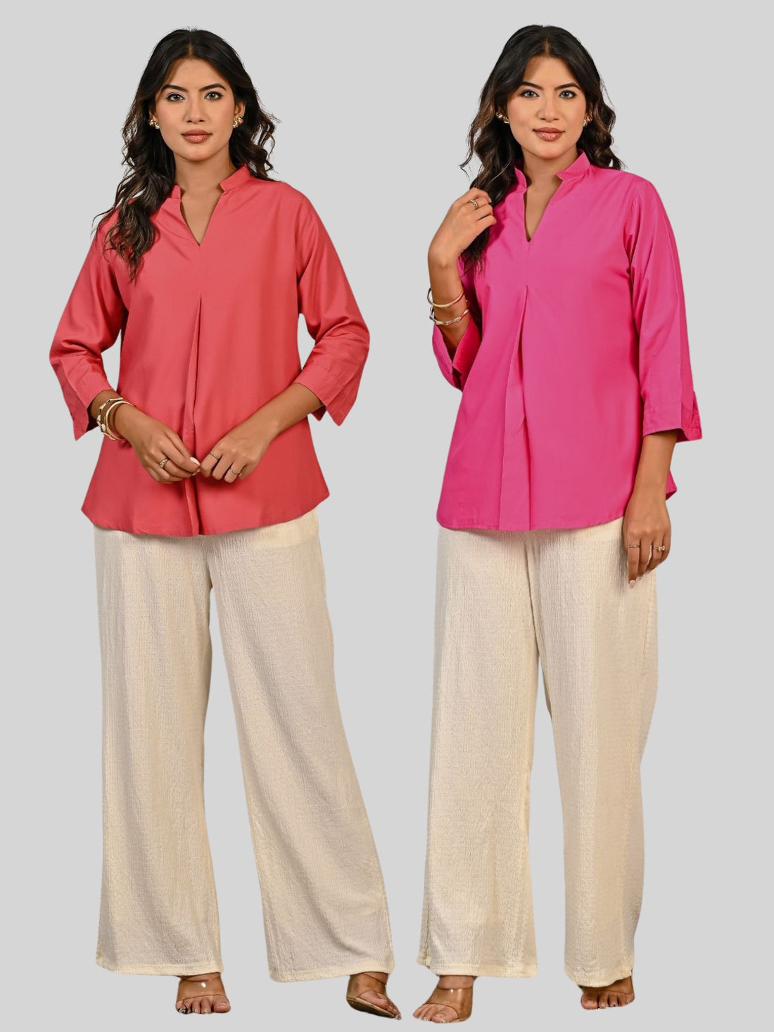 Solid Mauve Pink And Peach V Neck Viscose Pleated Tops Combo