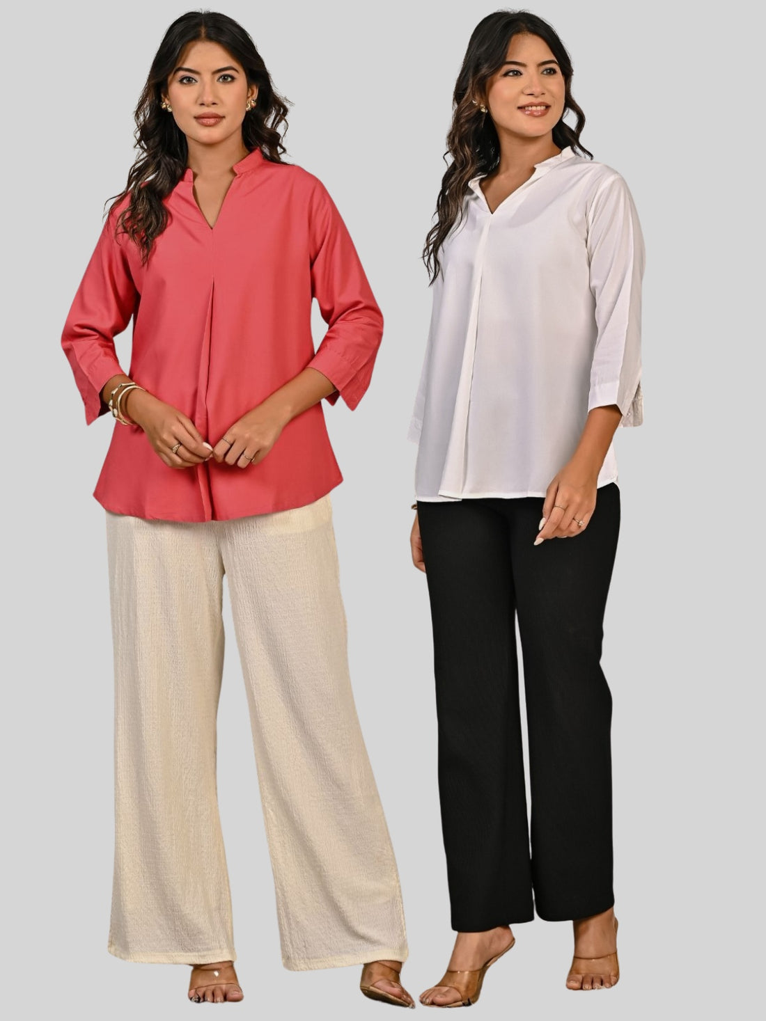 Solid Mauve Pink And White V Neck Viscose Pleated Tops Combo