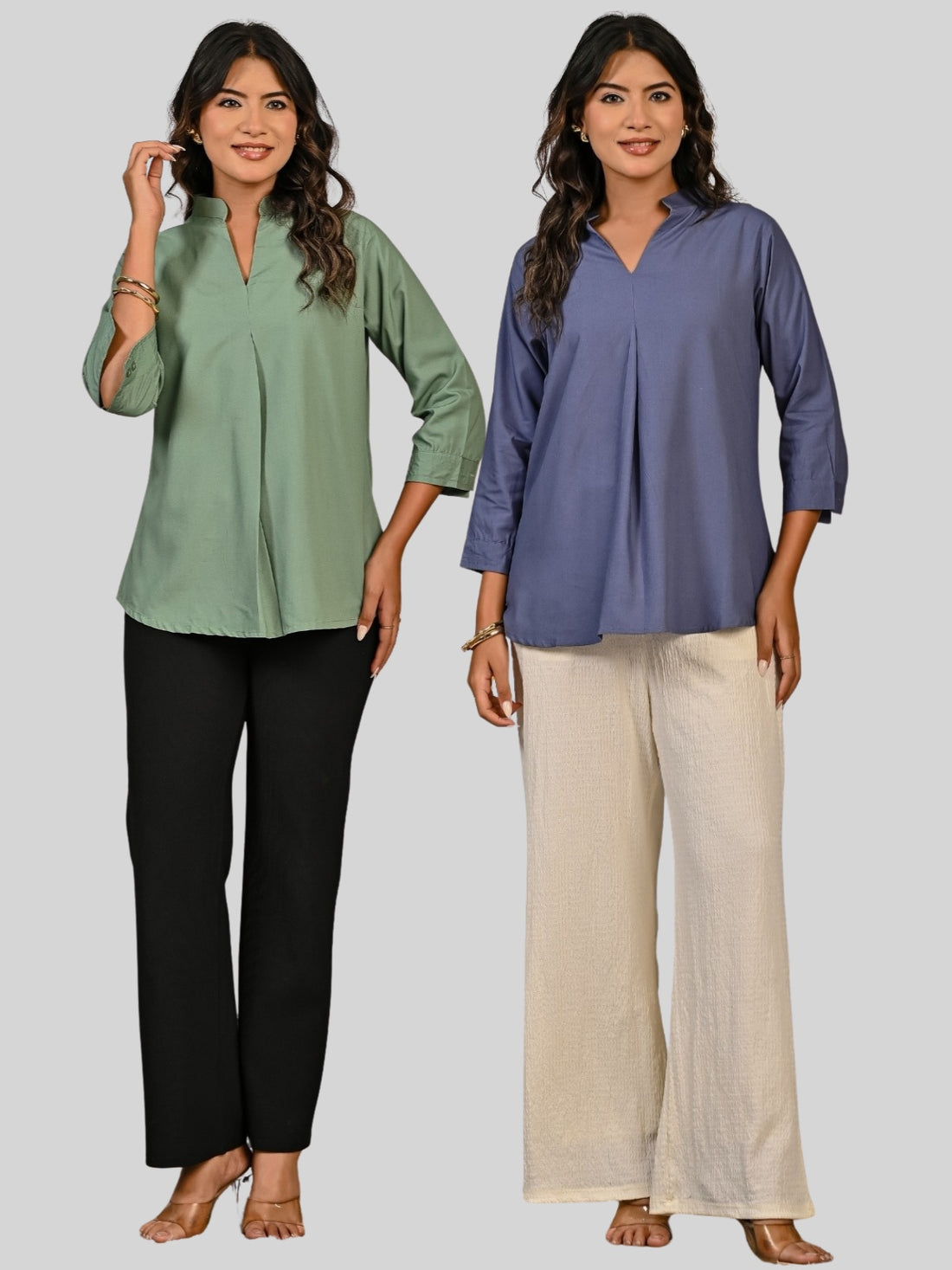 Solid Green And Sky Blue V Neck Viscose Pleated Tops Combo
