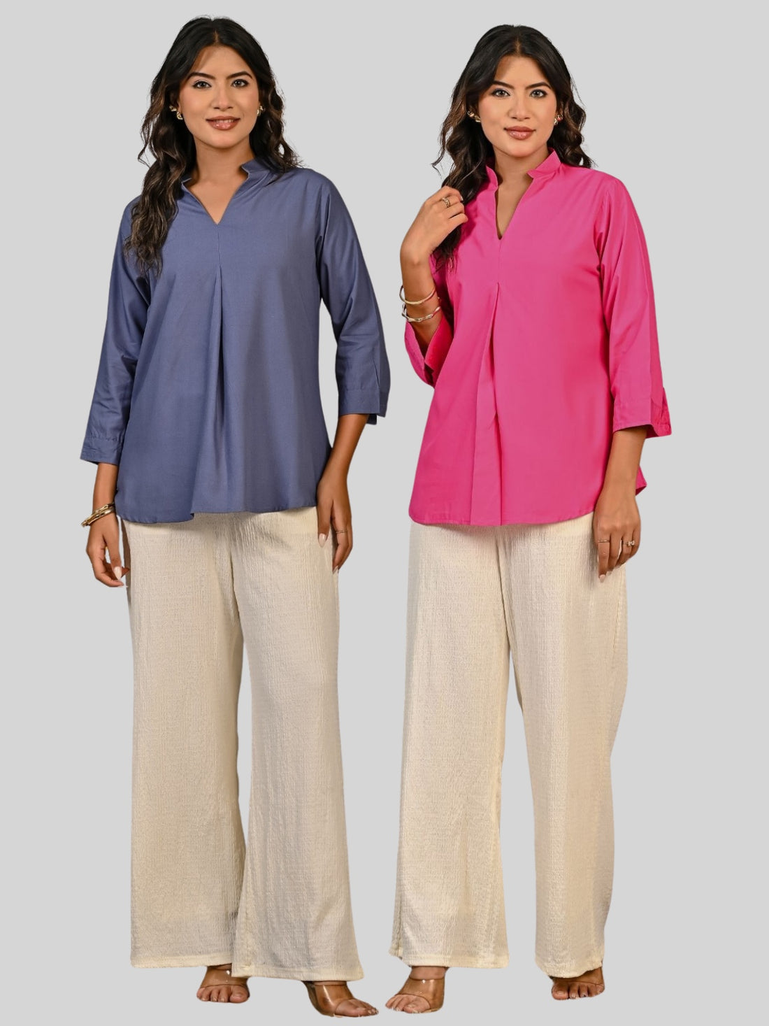 Solid Grey And Pink V Neck Viscose Pleated Tops Combo