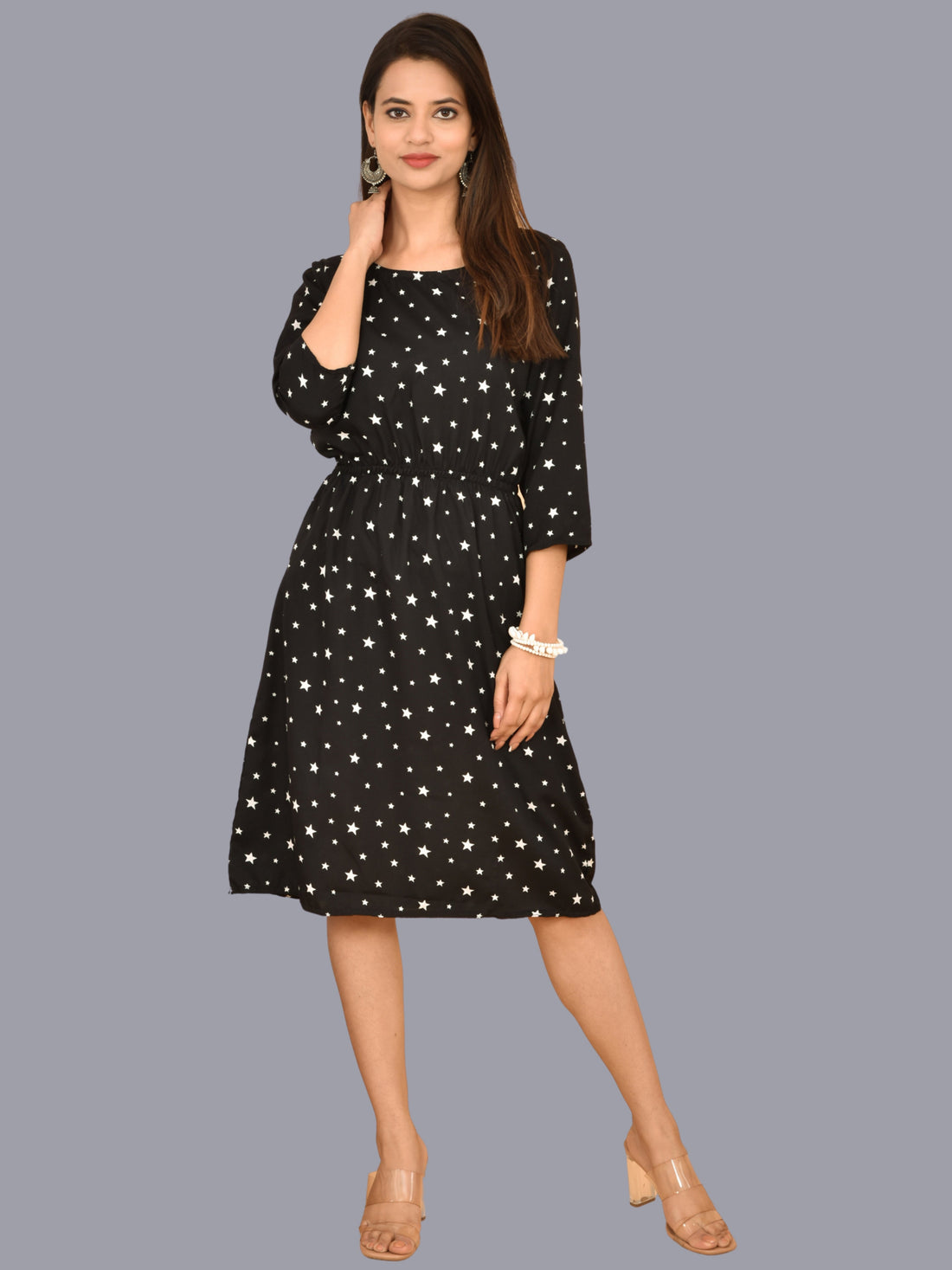 Womens Crepe Western Black Star Printed A Line Short Dress