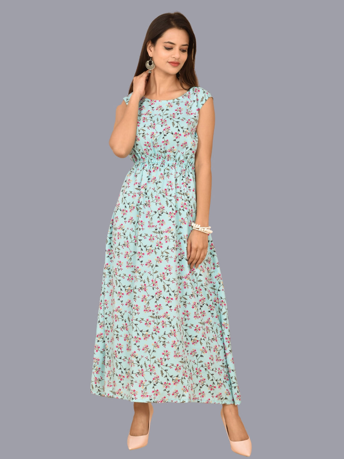 Womens Ice Blue Floral Printed Crepe Fabric Maxi Dress