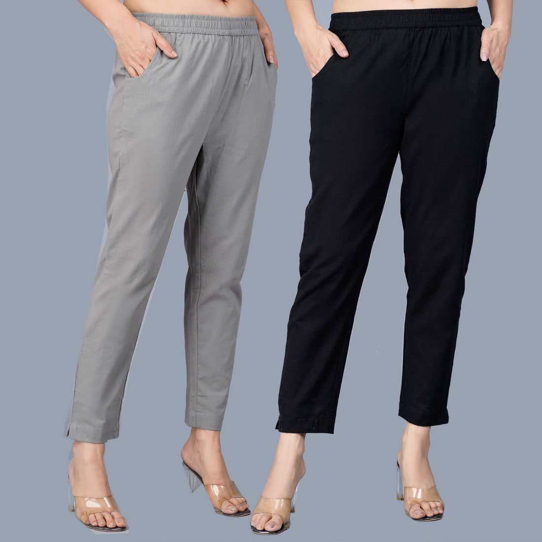 Pack Of 2 Womens Regular Fit Grey And Black Fully Elastic Waistband Cotton Trouser