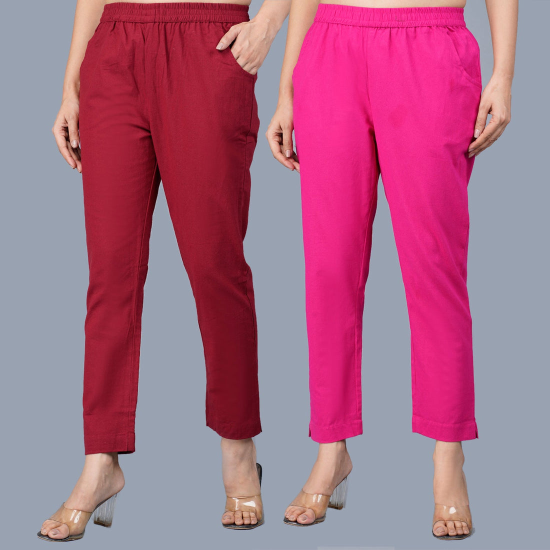 Pack Of 2 Womens Regular Fit Maroon And Rani Pink Fully Elastic Waistband Cotton Trouser