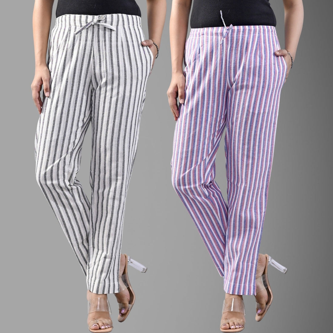 Pack Of 2 Light Grey And Blue Womens Cotton Stripe Pants Combo