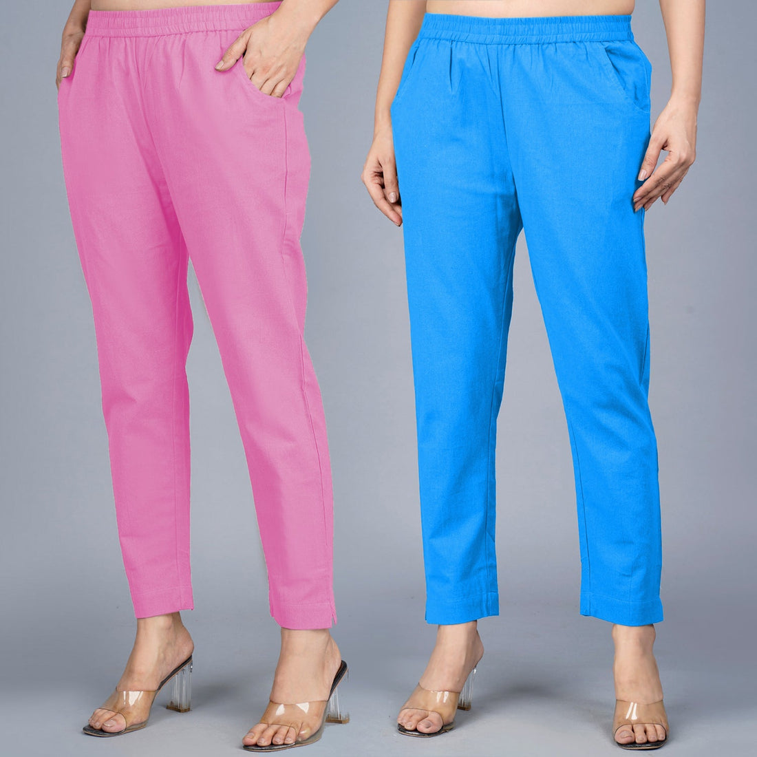 Pack Of 2 Womens Regular Fit Pink And Sky Blue Fully Elastic Waistband Cotton Trouser