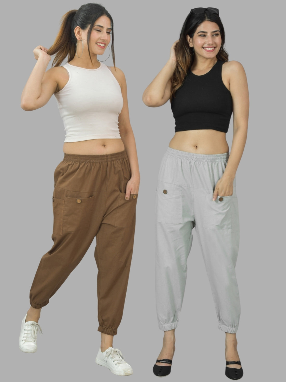 Combo Pack Of Womens Brown And Melange Grey Four Pocket Cotton Cargo Pants