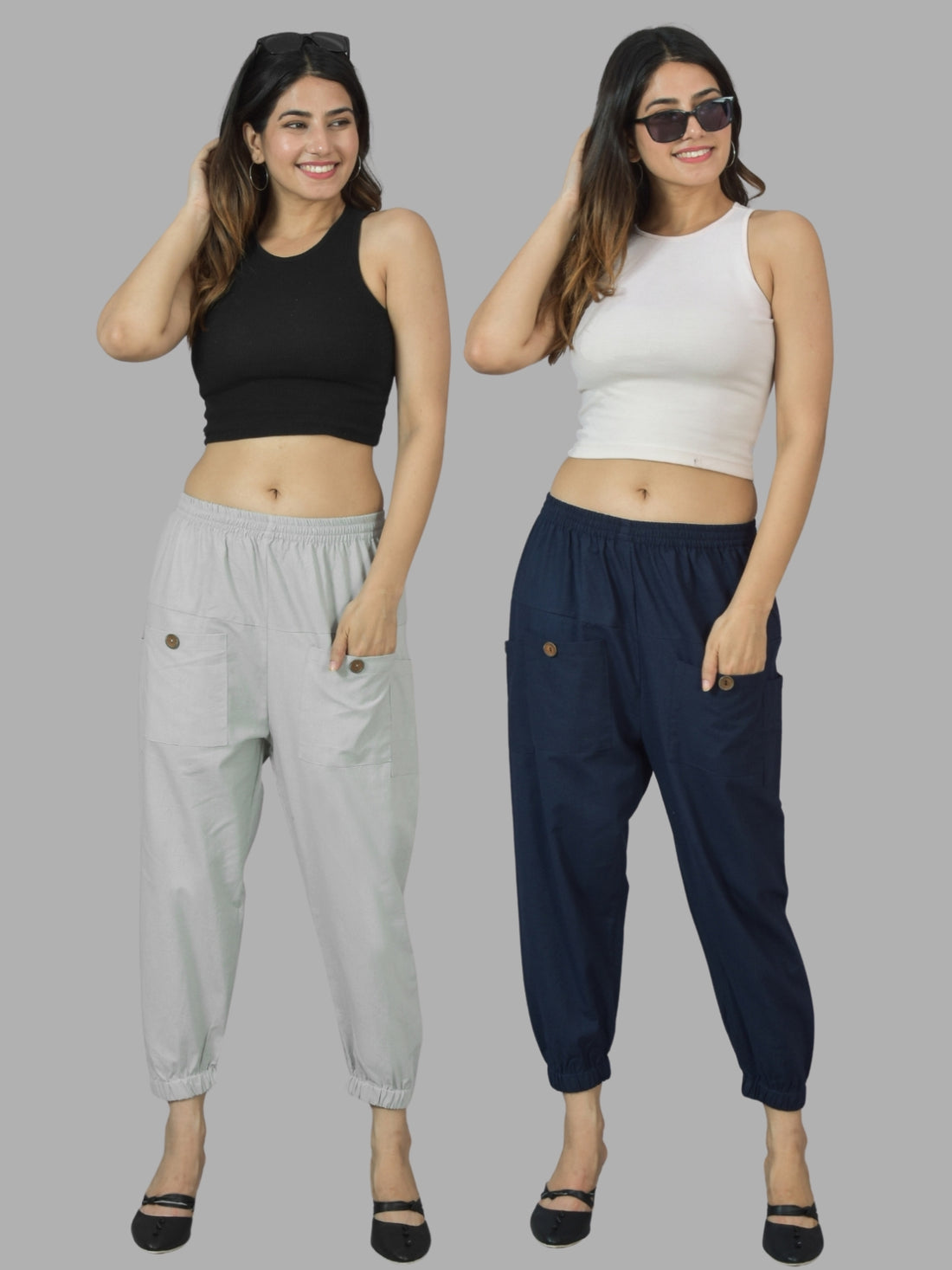 Combo Pack Of Womens Melange Grey And Dark Blue Four Pocket Cotton Cargo Pants
