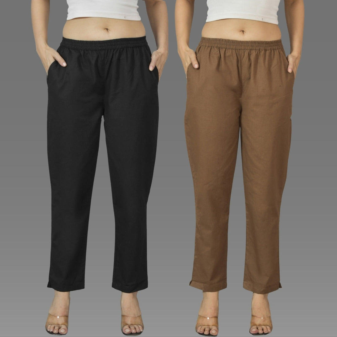 Pack Of 2 Womens Black And Brown Deep Pocket Fully Elastic Cotton Trouser