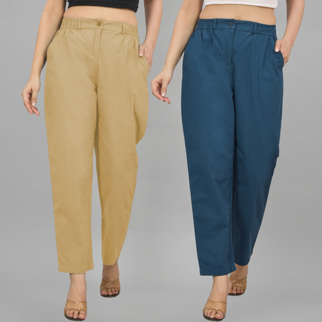 Combo Pack Of 2 Beige And Teal Blue Womens Cotton Formal Pants