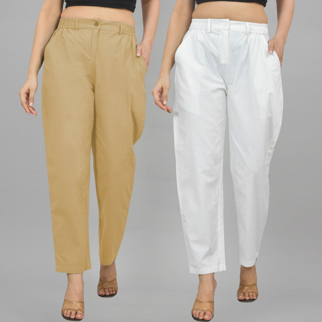 Combo Pack Of 2 Beige And White Womens Cotton Formal Pants