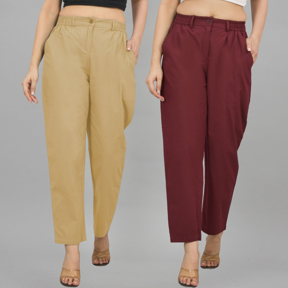 Combo Pack Of 2 Beige And Wine Womens Cotton Formal Pants