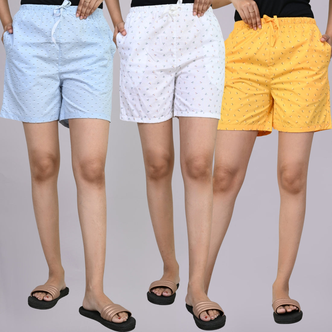Pack Of 3 Sky Blue, White And Yellow Printed Women Shorts Combo