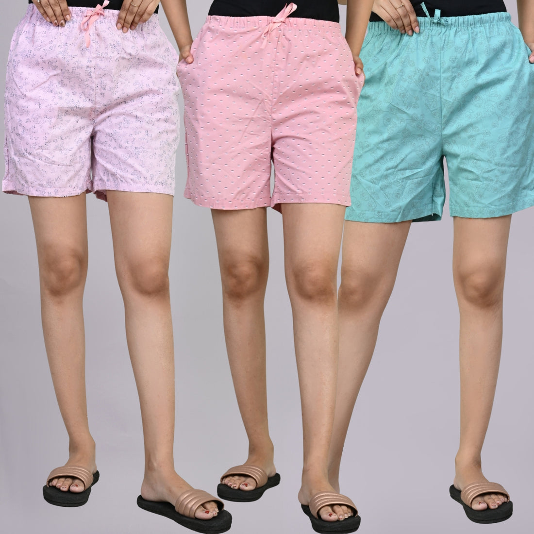 Pack Of 3 Light Pink, Pink And Sky Blue Printed Women Shorts Combo