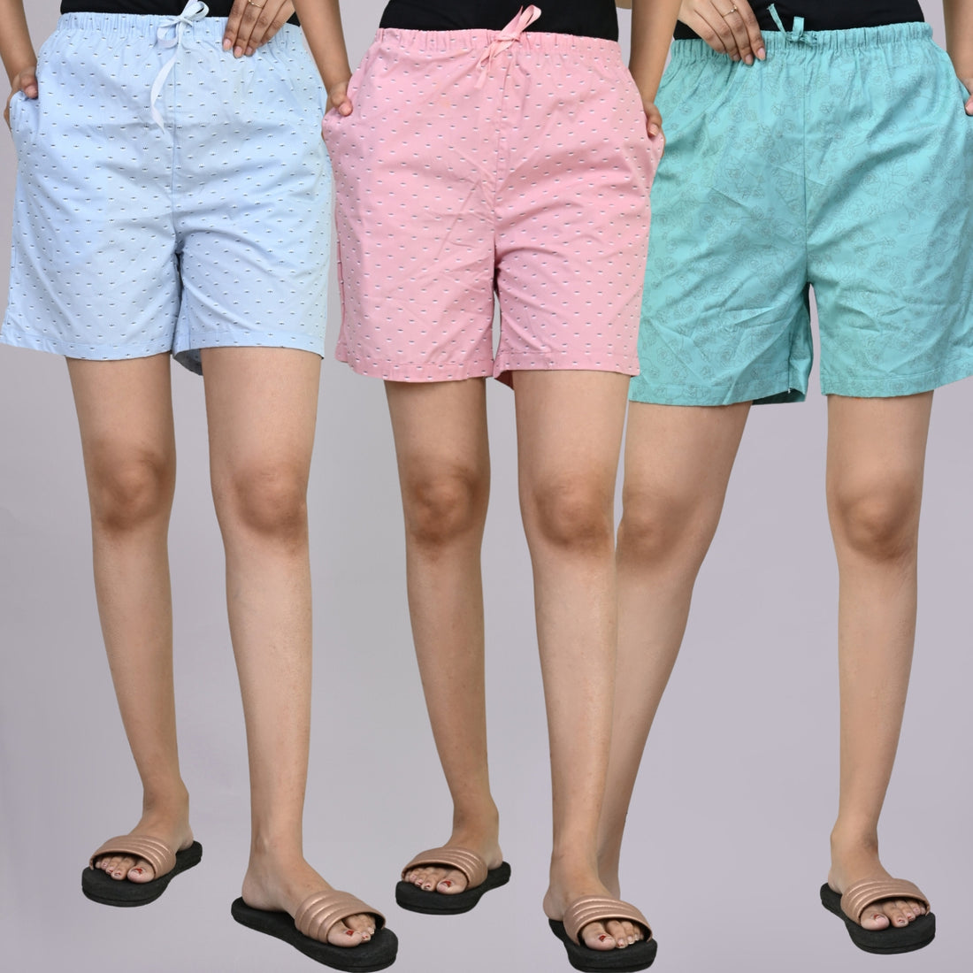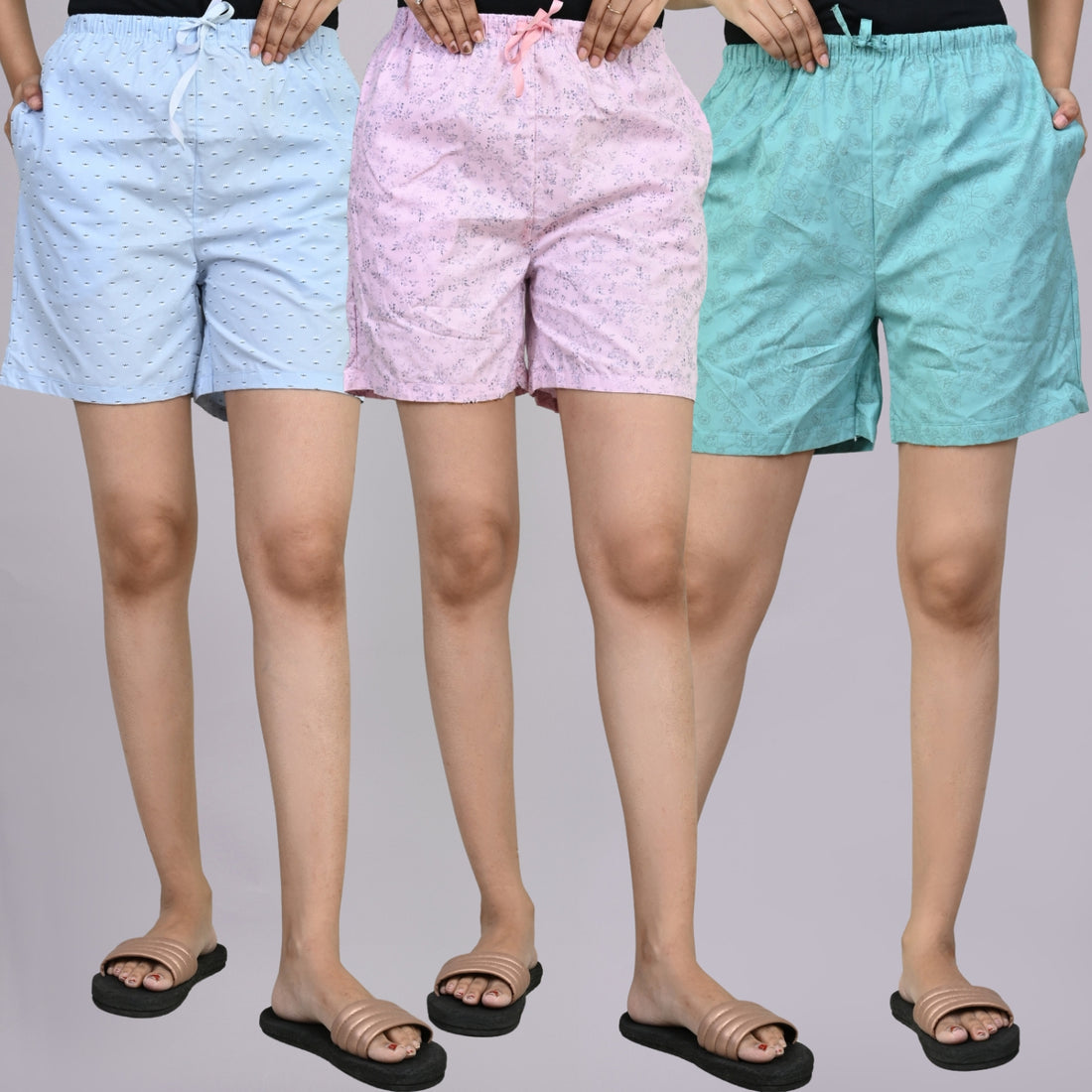 Pack Of 3 Blue, Light Pink And Sky Blue Printed Women Shorts Combo