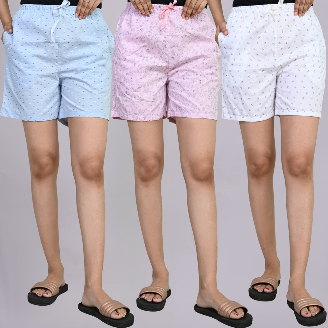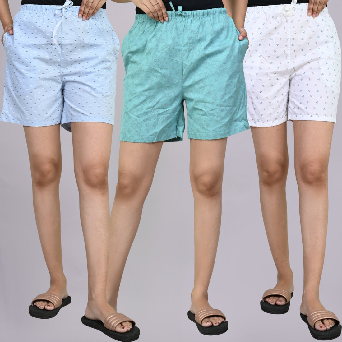 Pack Of 3 Blue, Light Pink And White Printed Women Shorts Combo