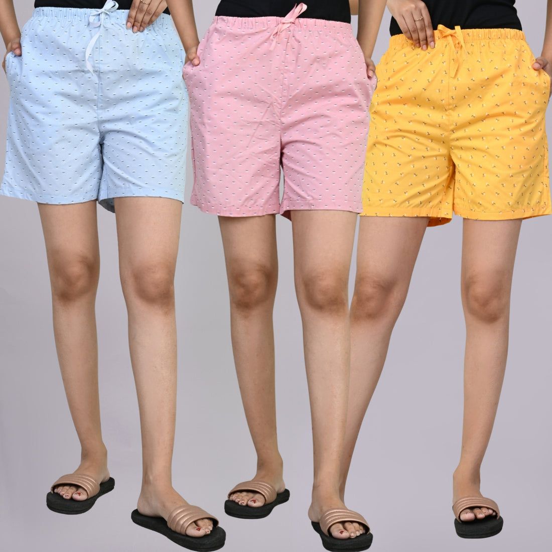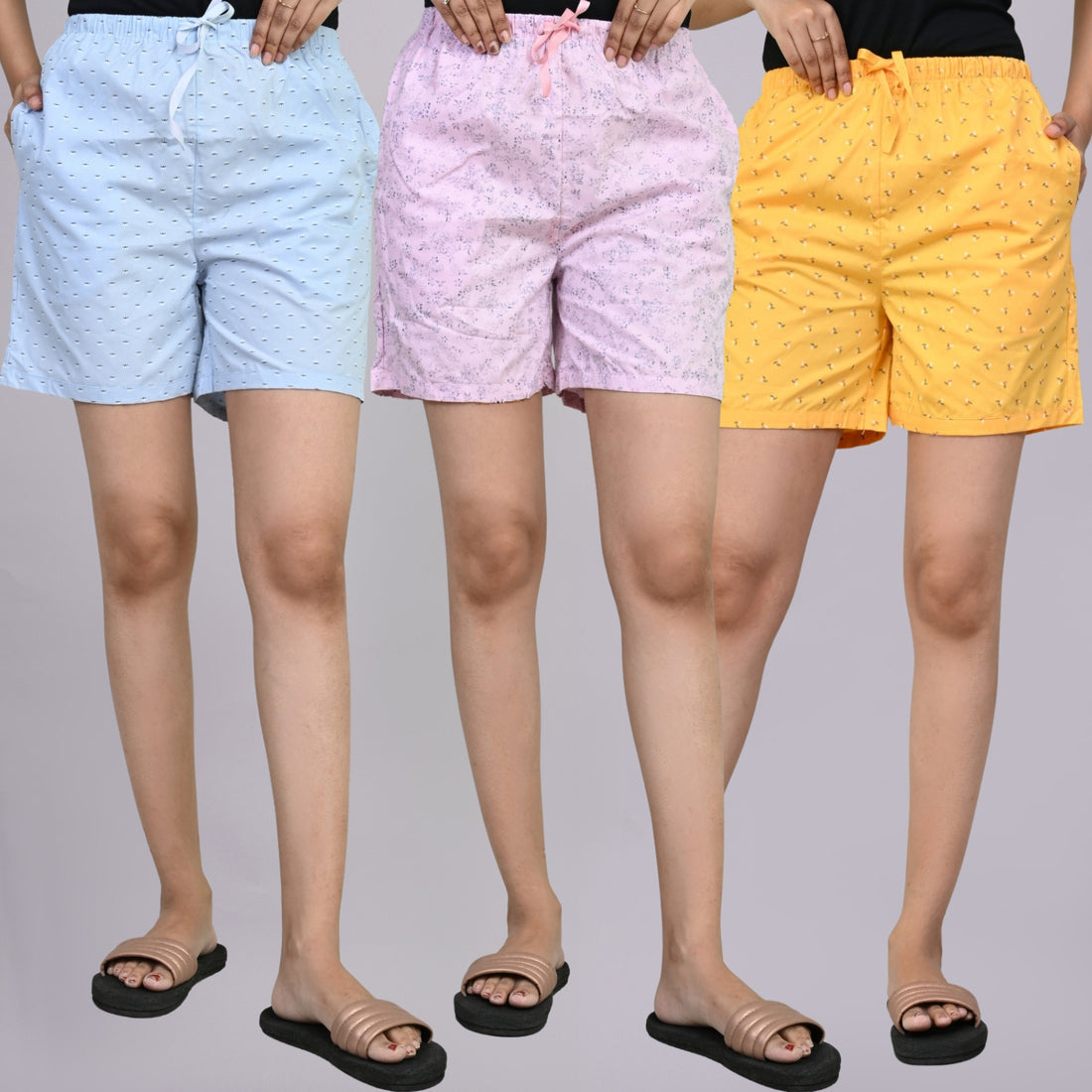 Pack Of 3 Blue, Light Pink And Yellow Printed Women Shorts Combo