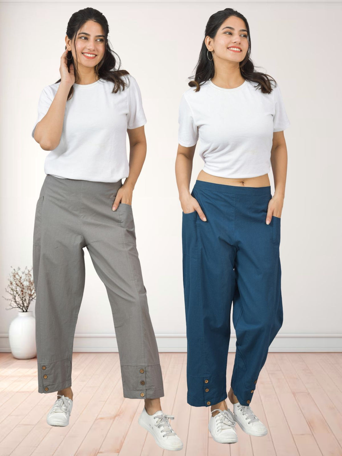 Combo Pack Of Womens Grey And Teal Blue Side Pocket Straight Cargo Pants