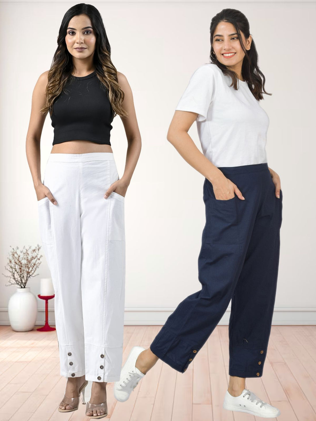 Combo Pack Of Womens White And Navy Blue Side Pocket Straight Cargo Pants