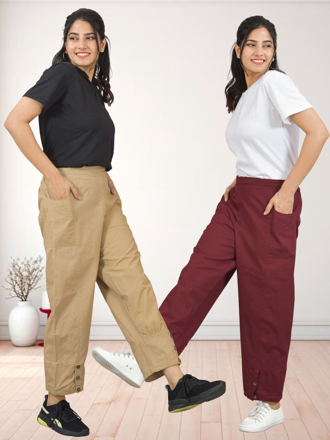 Combo Pack Of Womens Beige And Wine Side Pocket Straight Cargo Pants