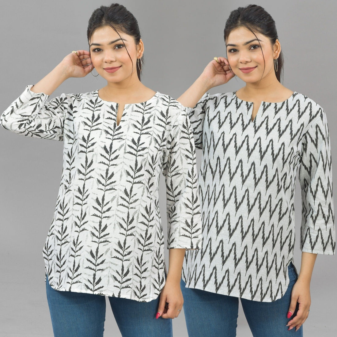 Pack Of 2 Womens Regular Fit Black Leaf And Black Zig Zag Printed Tops Combo
