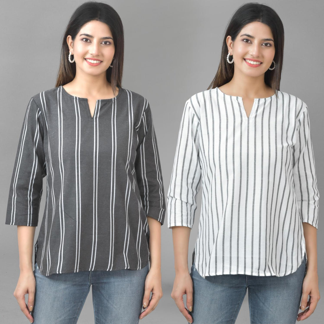 Pack Of 2 Black And Grey Striped Cotton Womens Top Combo