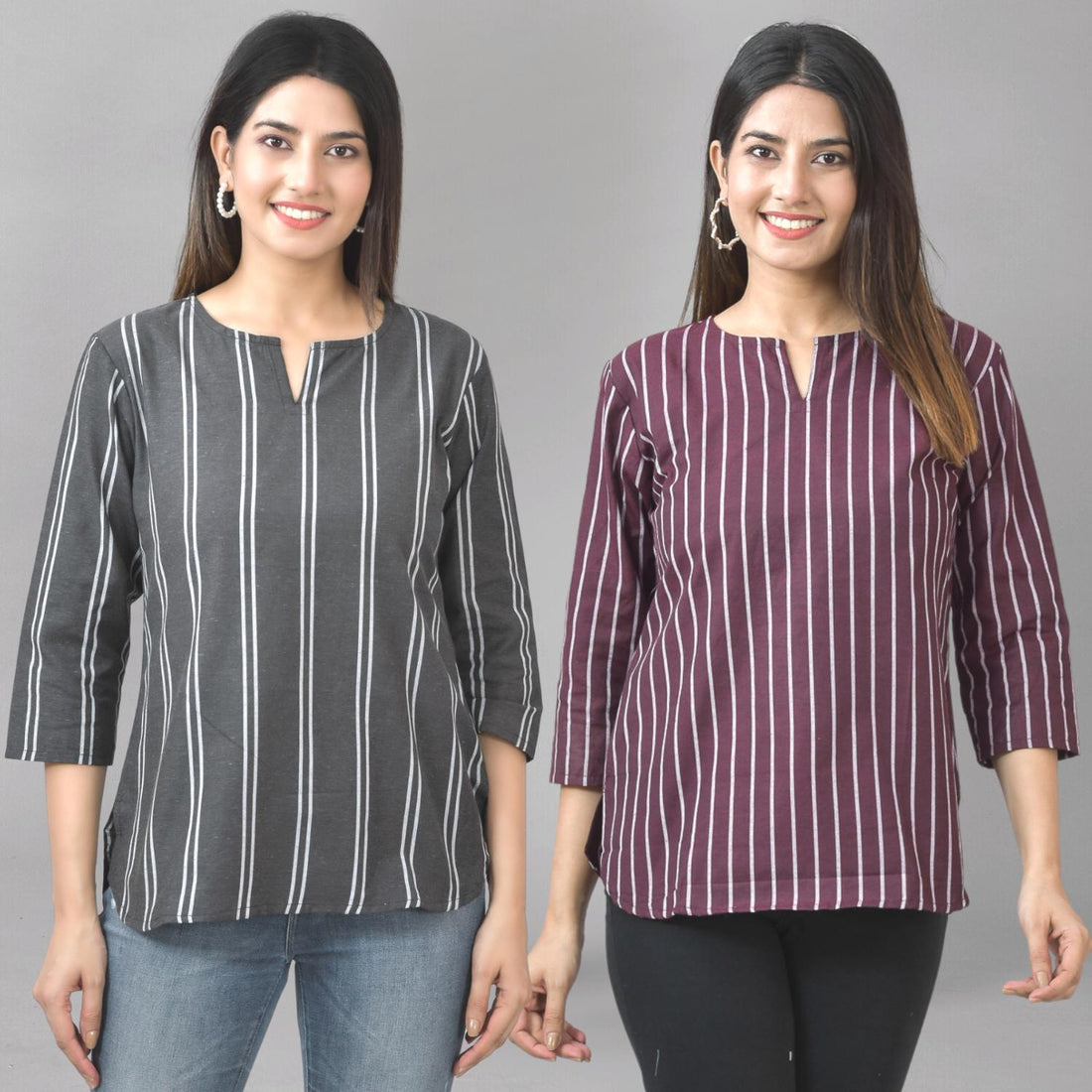 Pack Of 2 Black And Maroon Striped Cotton Womens Top Combo