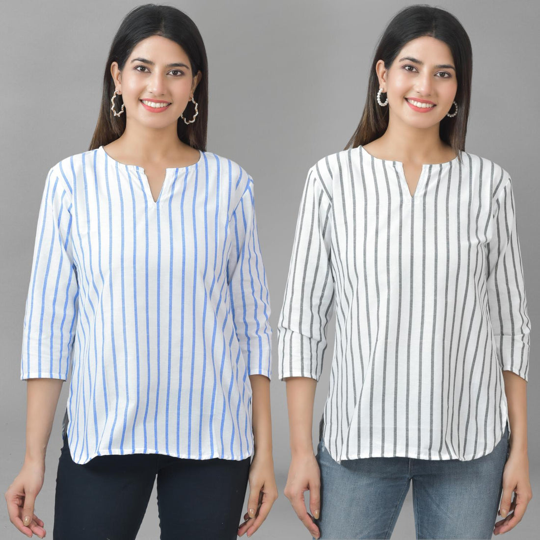 Pack Of 2 Blue And Grey Striped Cotton Womens Top Combo